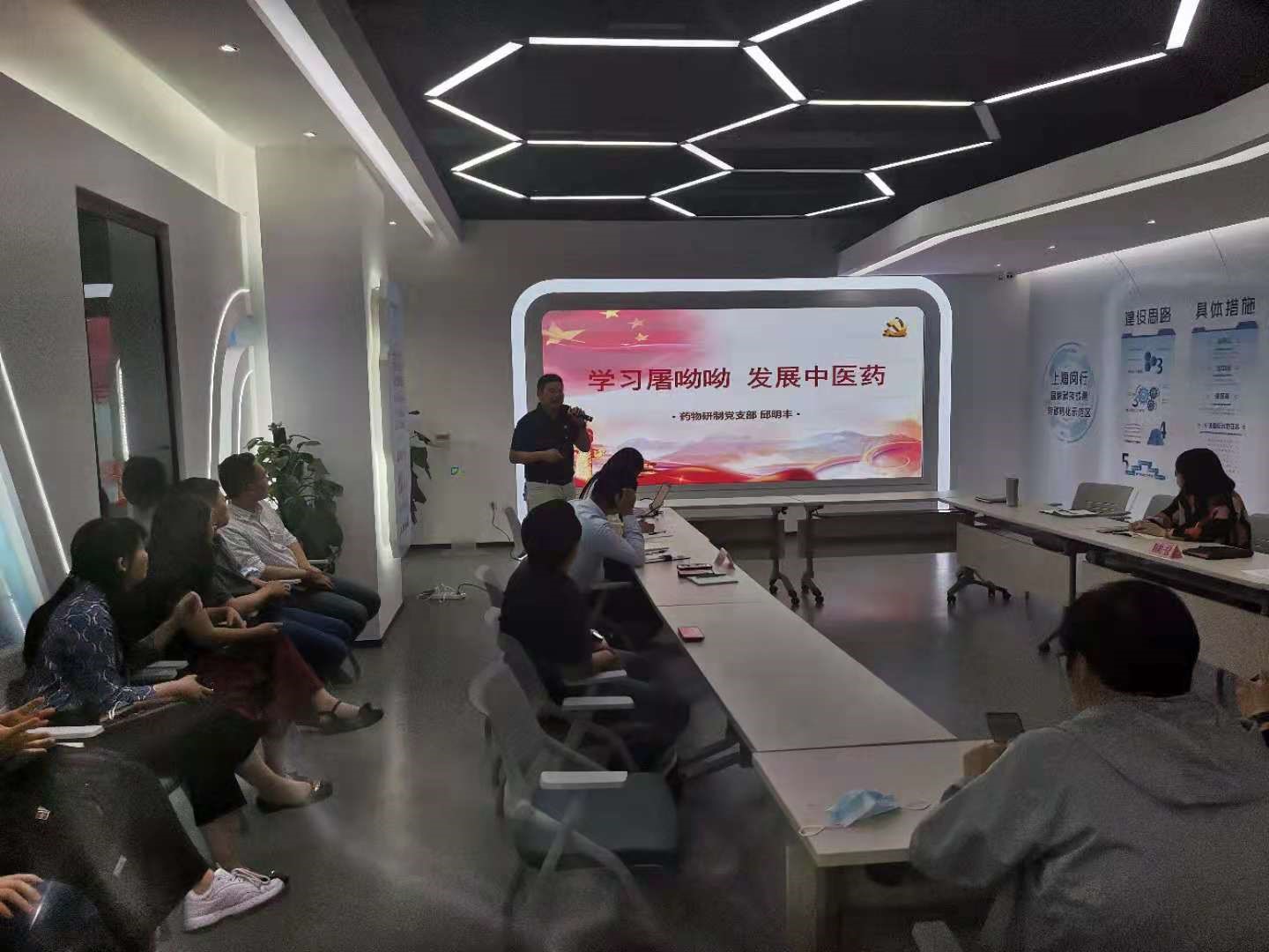 活动在闵行区科创服务中心一楼大厅开展,科协事业单位第一党支部书记杨磊首先解读了闵行区关于推进科技创新创业成果转化政策意见的解读,期待我院成果尽早尽快落地闵行。随后我院药物研制党支部书记邱明丰介绍了支部总体情况,突出介绍了药物研制党支部的学科学术专业科技特色,分享了《学习屠呦呦 发展中医药》微党课,讲述了荣获诺奖、全国优秀党员屠呦呦研究员为战胜三大死亡疾病之一的疟疾,研制青蒿素所经历的艰苦岁月、所闪现的共产党员光芒与精神。最后,四个党支部一起学习了中国共产党的成立、讲述海南琼崖纵队雕塑《艰苦岁月》的党史微电影,并做了建党一百周年党史内心体验的深入交流。