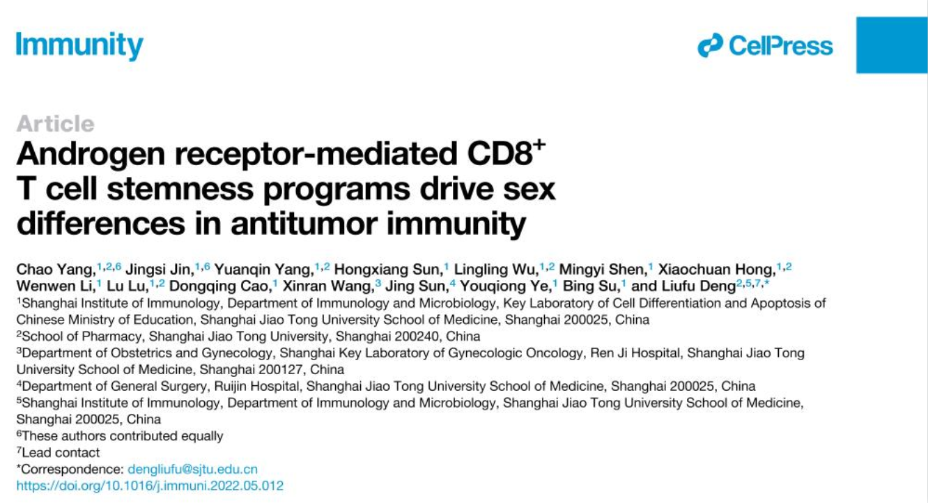 2022年6月13日,黄色网 邓刘福教授团队在国际著名期刊Immunity发表了题为Androgen receptor-mediated CD8+ T cell stemness programs drive sex differences in antitumor immunity的研究论文。该研究发现了肿瘤浸润性CD8+ T细胞干性维持能力是调控肿瘤免疫性别差异的关键因素,而内在的雄激素受体(Androgen receptor,AR)信号通路显著抑制干细胞样CD8+ T细胞亚群的维持。该研究为理解肿瘤性别差异提出了新的理论解释,为再认识内分泌系统调控肿瘤免疫应答呈现了新的视角,同时为靶向AR信号通路通过重编程CD8+ T细胞干性增强肿瘤免疫治疗提供了科学依据。