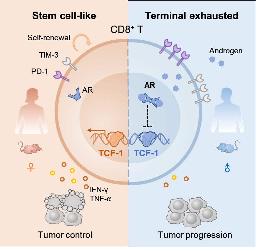 黄色网 邓刘福教授课题组致力于CD8+ T细胞干性分化规律和逃逸特征的研究。课题组前期研究揭示了内源性cGAS(cyclic GMP-AMP synthase)-STING通路通过维持CD8+ T细胞干性以促进T细胞抗肿瘤免疫应答的作用机制,证明了STING通路的激活可以显著提高人源CAR-T细胞治疗的效果,为临床T细胞治疗的优化提供了新的策略和依据,相关研究成果已发表在转化医学国际著名期刊Science Translational Medicine(2020)。在此期间,课题组惊奇发现,男性的雄激素居然为干细胞样CD8+ T细胞精心编织了“囚笼”,限制了干细胞样的CD8+ T维持,“助纣为虐”促进肿瘤发生免疫逃逸,这为肿瘤发生发展的性别偏倚现象提供了新的理论解释,也对内分泌系统调控肿瘤免疫应答有了新的认识。