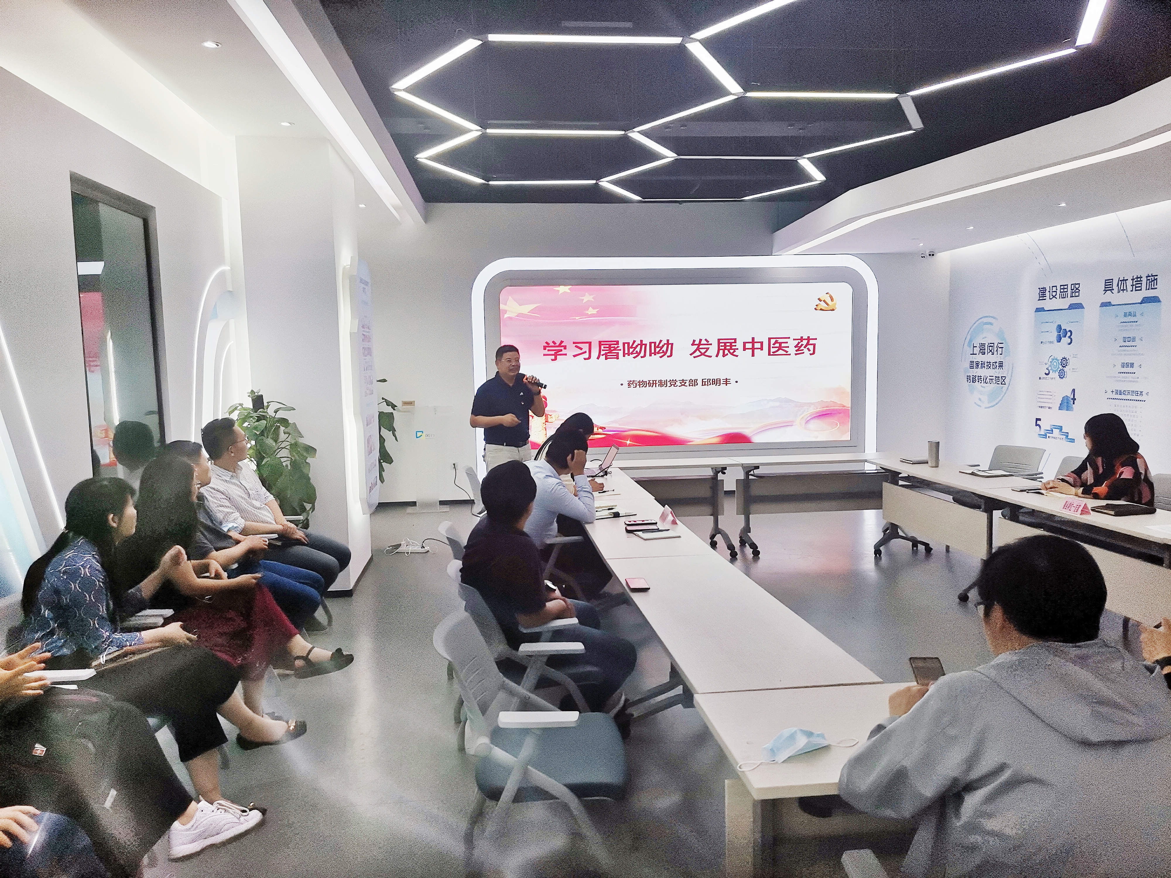 活动在闵行区科创服务中心一楼大厅开展,科协事业单位第一党支部书记杨磊首先解读了闵行区关于推进科技创新创业成果转化政策意见的解读,期待我院成果尽早尽快落地闵行。随后我院药物研制党支部书记邱明丰介绍了支部总体情况,突出介绍了药物研制党支部的学科学术专业科技特色,分享了《学习屠呦呦 发展中医药》微党课,讲述了荣获诺奖、全国优秀党员屠呦呦研究员为战胜三大死亡疾病之一的疟疾,研制青蒿素所经历的艰苦岁月、所闪现的共产党员光芒与精神。最后,四个党支部一起学习了中国共产党的成立、讲述海南琼崖纵队雕塑《艰苦岁月》的党史微电影,并做了建党一百周年党史内心体验的深入交流。
